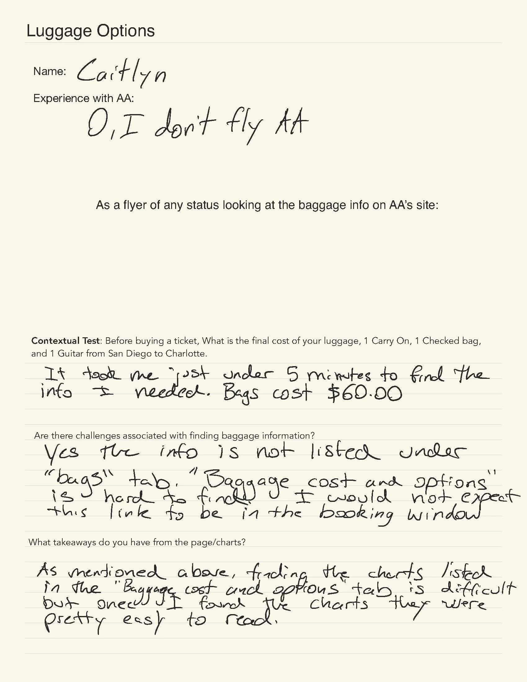 I approached two well-traveled people for this exercise, Lois and Caitlyn. Lois once held status with AA, while Caitlyn has little experience with the airline. The exercise was to go on AA.com and find the luggage cost for three different types of baggage, while I observed their interactions.