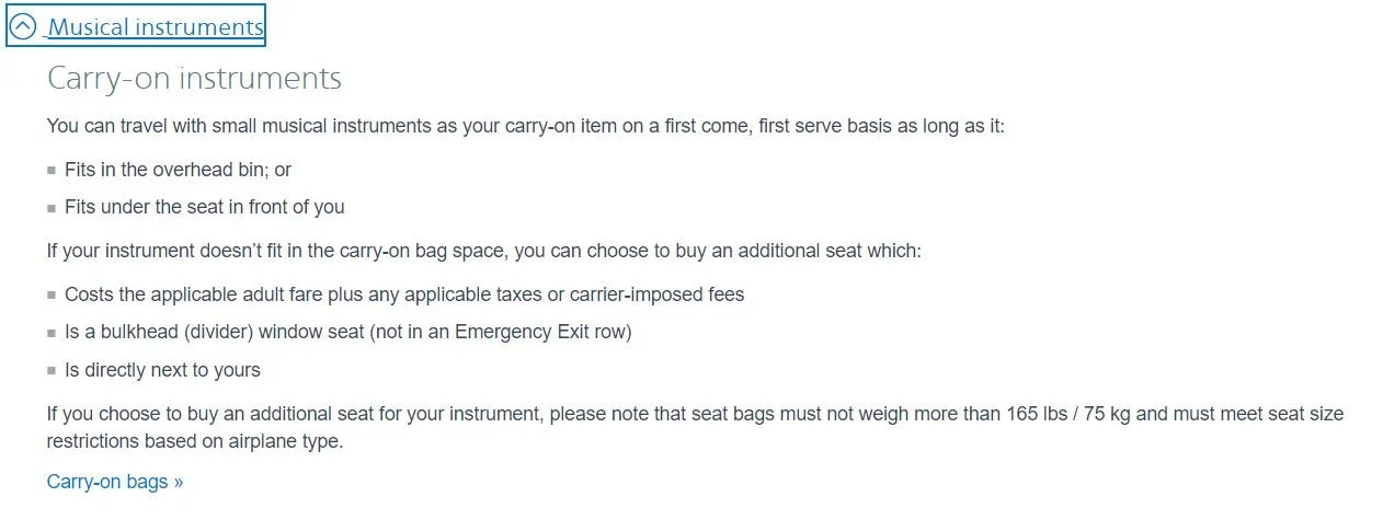 She had previous knowledge of AA’s baggage policy, being a past status holder. In the past, her 1st bag was free as an AAdvantage member. As a non-frequent flyer, her 1st checked bag was $30. She found out that smaller musical instruments could be considered carry-on luggage first come, first serve. However, there is nothing confirmed on the size that would not be considered too large to carry on. She decided to run with the assumption that the instrument would fit within restrictions to be her carry-on. AA allows one carry-on and a personal item. Lois mentioned that her “carry-on” would qualify as a personal item.