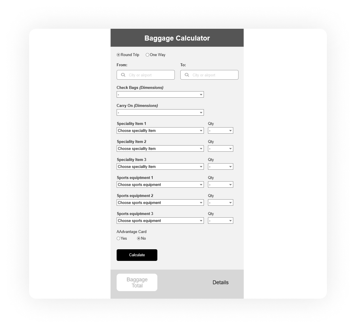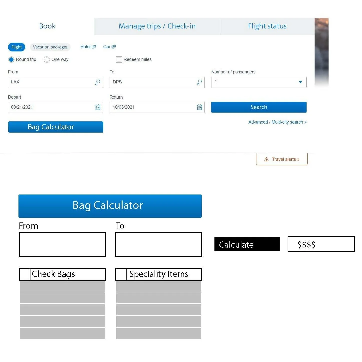 The process of searching through charts and text to find out bag costs could be similar to Google flights, where you add the bags into the cost of the flights. A second solution could be a Luggage Calculator. All the data from the chats could be compressed into a window where the user enters the number of check bags or specialty item and their destination to see a final cost and options.